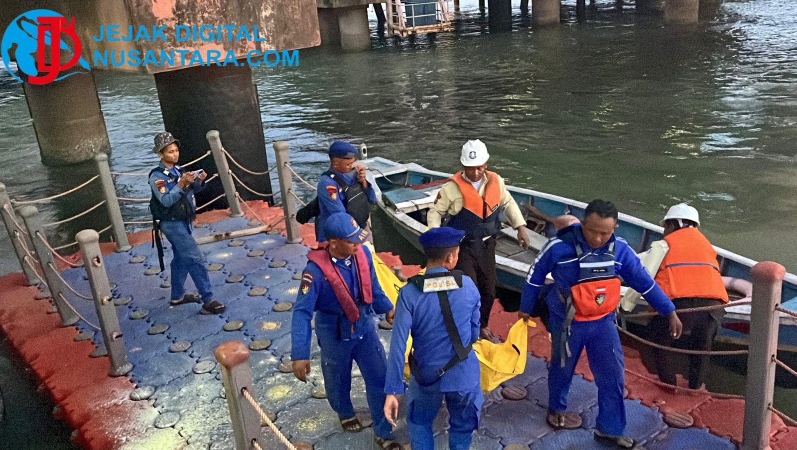 Evakuasi jasad korban berhasil diangkat dari perairan dan dibawa ke dermaga untuk pemeriksaan awal.
